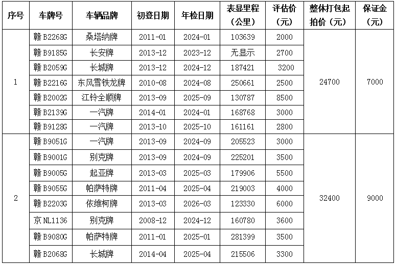 2、上述表格内表显里程为第三方评估机构评估基准日显示,仅供参考,需意向竞买人自行到标的所在地实地勘察确定表显里程公里数。