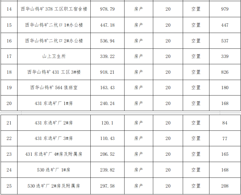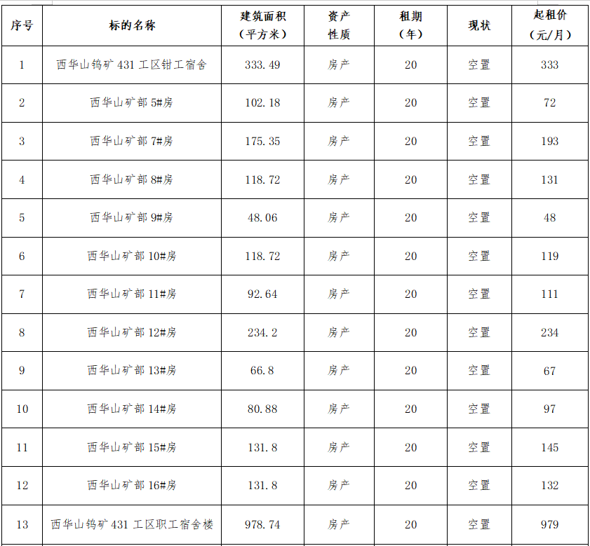 3、出租标的位于原西华山钨矿老矿部附近,出租范围仅限于标的的25处房屋,其余建筑物不在出租范围内。如未经有关部门批准,私自动用标的范围外的土地、林地、建筑物、附属物等,请自行承担法律后果。