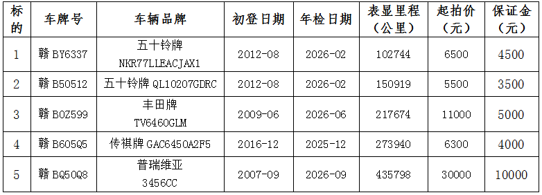 受委托,本公司定于2025年12月3日上午10:00开始拍卖江西省烟草公司赣州市公司处置的五辆公司公务用车,现将有关事项公告如下: