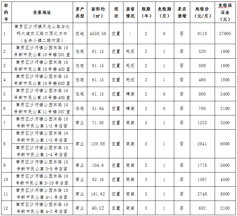 赣州智和园区运营管理有限公司章贡区沙河镇新市民公寓等十二宗资产公开招租网络竞价公告