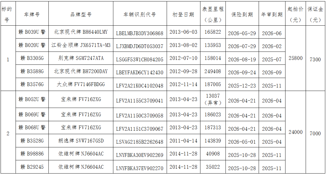 2、上述表格内表显里程为第三方评估机构评估基准日显示,仅供参考,需意向竞买人自行到标的所在地实地勘察确定表显里程公里数。本次拍卖部分车辆相关保险已经到期。