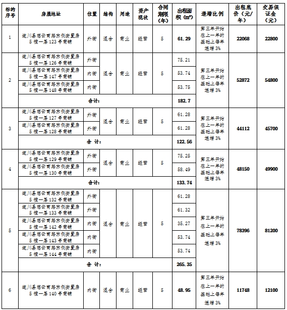 4.挂牌价格为第一年租金。租金递增标准:租赁期间前两年租金不递增,租金以成交价为准,租金第三年开始在上一年的基础上每年递增3%。