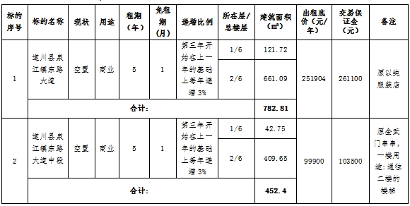 5.挂牌价格为第一年租金。租金递增标准:租赁期间前两年租金不递增,租金以成交价为准,租金第三年开始每年在上一年的基础上递增3%。