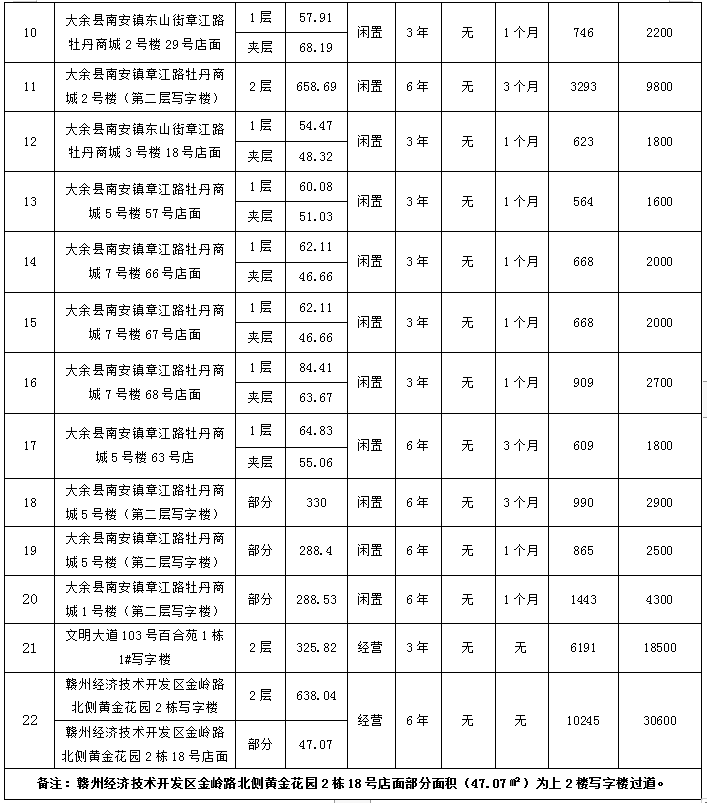 大余县牡丹商城店面、经开区黄金花园写字楼22宗资产公开招租公告