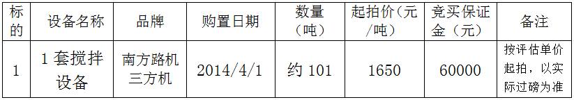 赣州开元万年青商砼有限公司拟资产处置事宜涉及其持有1套搅拌设备拍卖公告